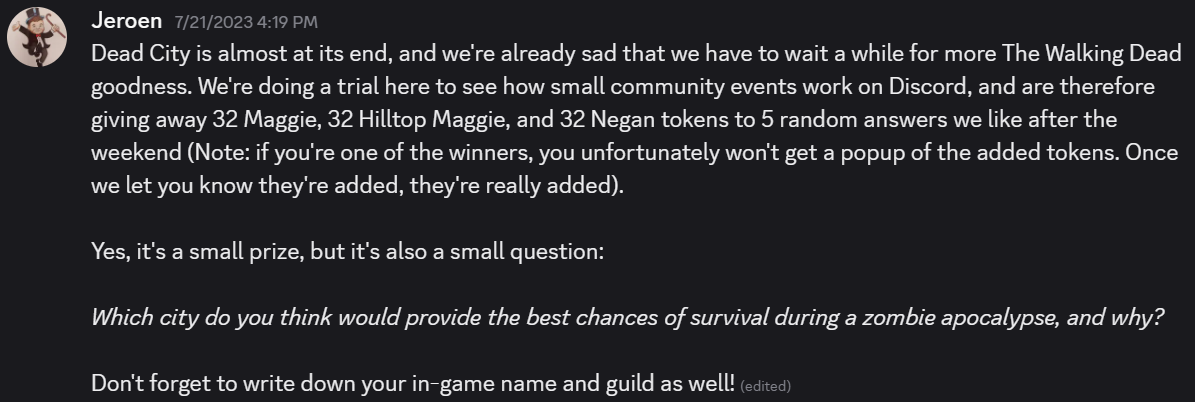 The Walking Dead: No Man's Land is a tactical, turn-based game based on The Walking Dead universe, where players recruit and upgrade survivors to fight through hordes of walkers and complete missions. Combining strategy, resource management, and iconic characters from the series, players must build a strong team and base to survive in a post-apocalyptic world. As the Senior Community Manager, I am in charge of all matters regarding Community and communication.